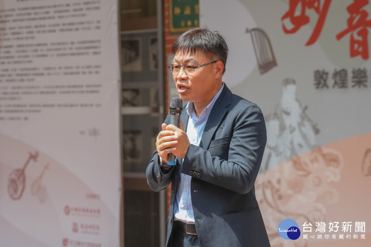 作為本展覽地主方的玄奘大學,簡紹琦校長致詞表示,玄奘有藝術設計學院,而敦煌跟藝術、音樂、設計息息相關,師生們不用遠到三千公里外的敦煌,就可以看到石窟裡面實際的景象,就如同來到學校視傳系的虛擬世界裡,不用戴眼鏡就能進入石窟觀賞壁畫,這次展覽機會相當難得,他鼓勵師生們都能觀展。另外校長也舉例自己把經變誤認為變經,來到展場參觀意外吸收很多知識。