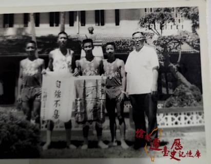 擔任守門員的他,拿著錦旗「自強不息」,與隊友、體育組長李鳳梧(右)合影。
