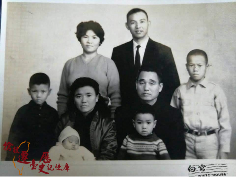 梁功斌(前排右一)五歲時與家人合影,二排右起為大哥、父親、母親、二哥,三排為姐夫與姐姐。母親手上抱著剛出生的小外孫。