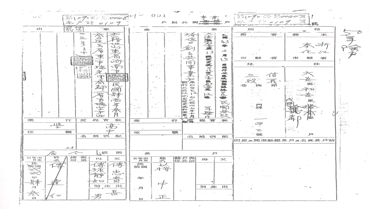傅達仁赴台後的戶口名簿,戶長為蔣中正。
