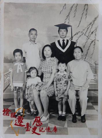 魯蓮芝(右三)全家,先生湯森榮(後排左)與兩女兒,及魯蓮芝的母親(右一)與小弟(後排右)及大妹兒子(右二)合影。