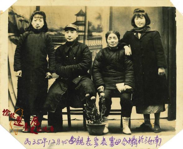 1946年(民35)12月陳嘉德(右一)在河南省汝南老家與母親(右二)與表舅和表舅媽合影。陳嘉德提供