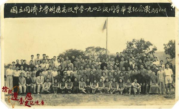 國立同濟大學附屬中學1945年級同學畢業紀念合影。陳嘉德為前排坐地上女生的左起第三位。陳嘉德提供