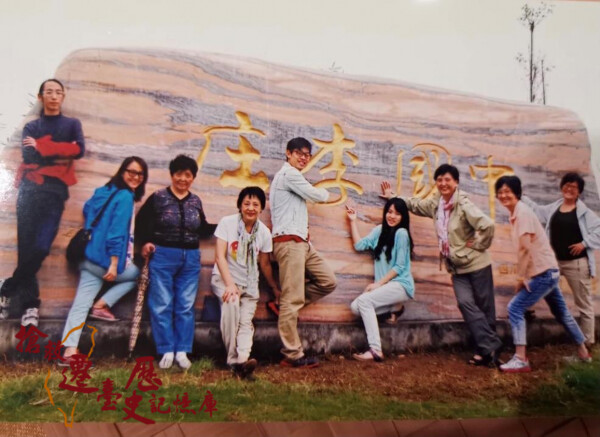 陳嘉德(左3)在三代返鄉之旅中,特別造訪四川南溪李莊,也就是同濟大學在抗戰時期的所在地,三代共九人在大石碑前合影留念。凌爾祥/提供