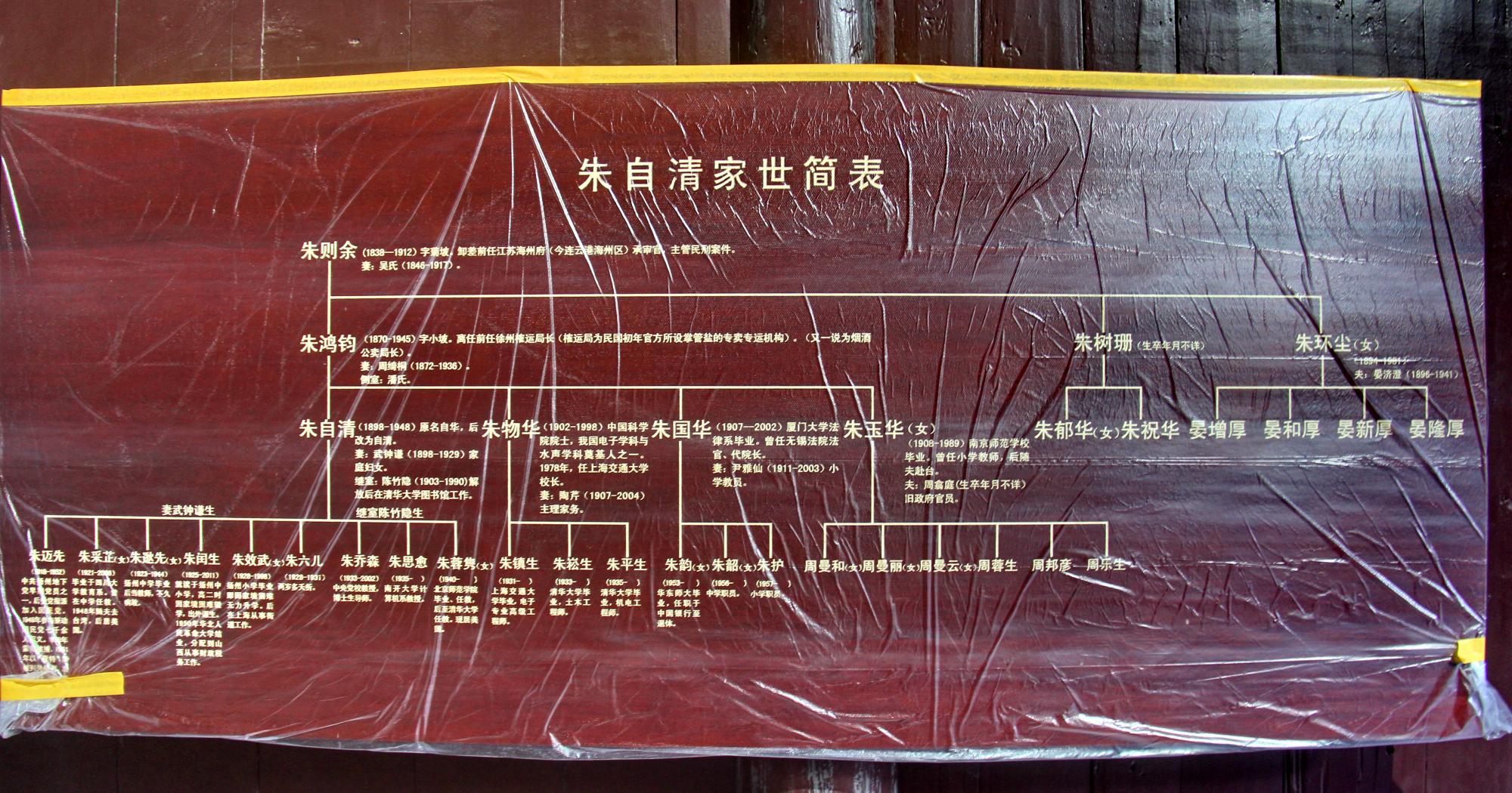 族譜從朱自清祖父朱則余開始,經過其父朱鴻鈞,下傳原名朱自華的長子朱自清、次子朱物華、三子朱國華與小妹朱玉華。