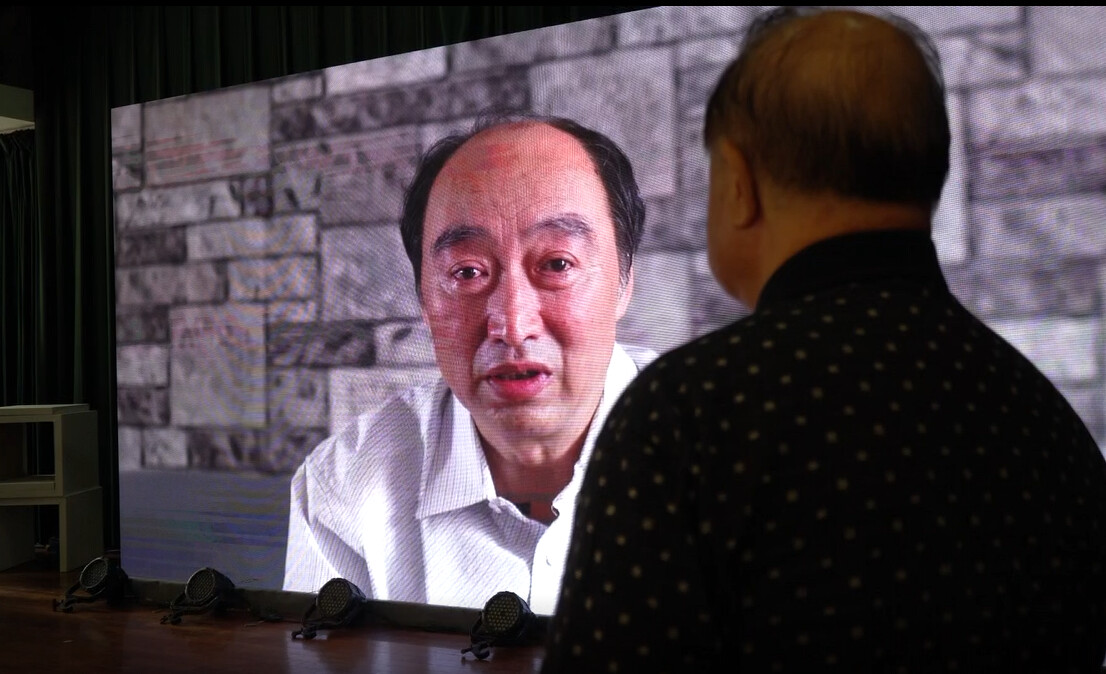 朱自清大陸嫡孫朱小濤(左)錄製影片問候臺灣的表叔周蓉生。