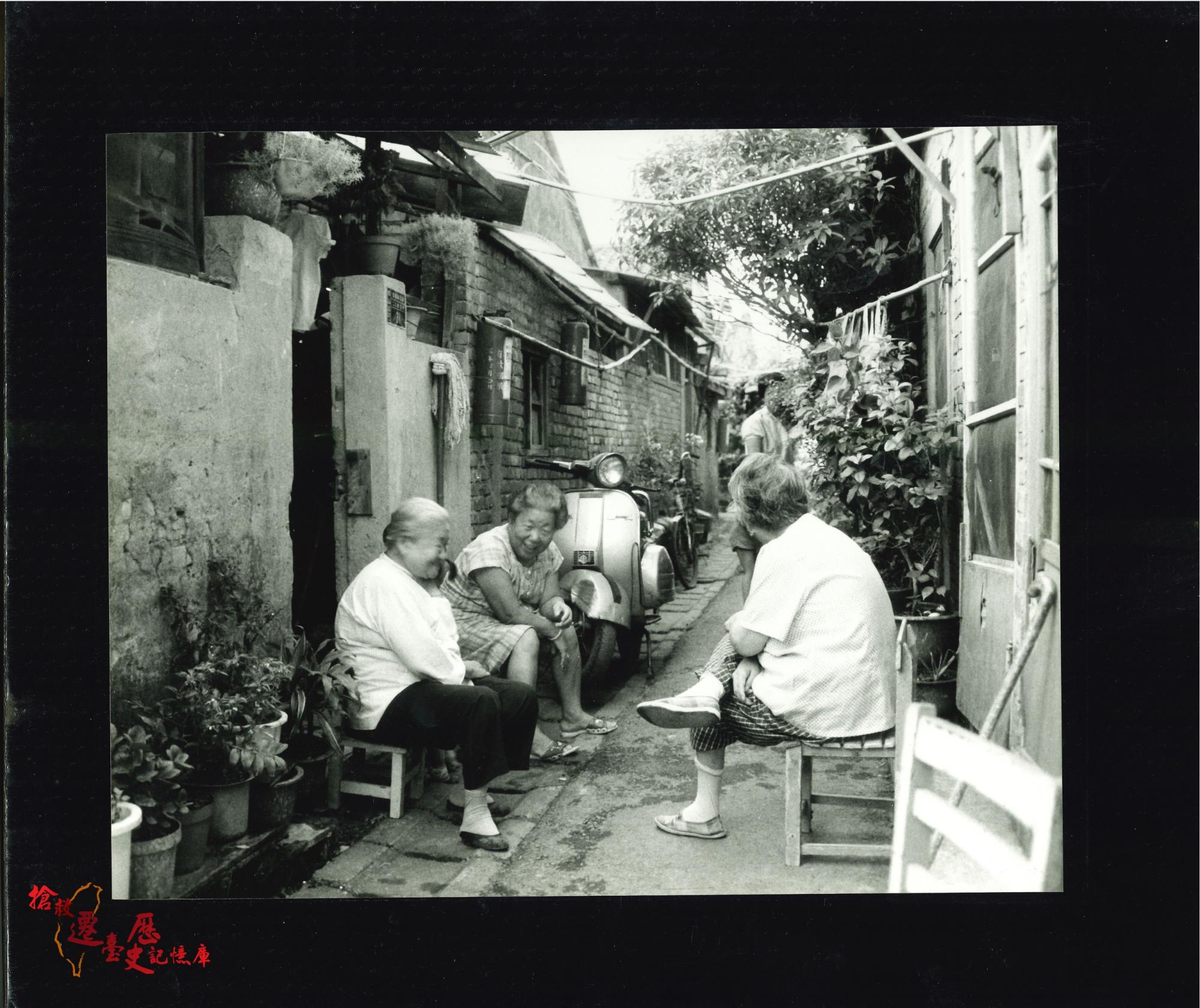 李富城母親馬振英(左)與舅媽(中)、鄰居坐在四四南村的家門口聊天。 圖/李富城提供