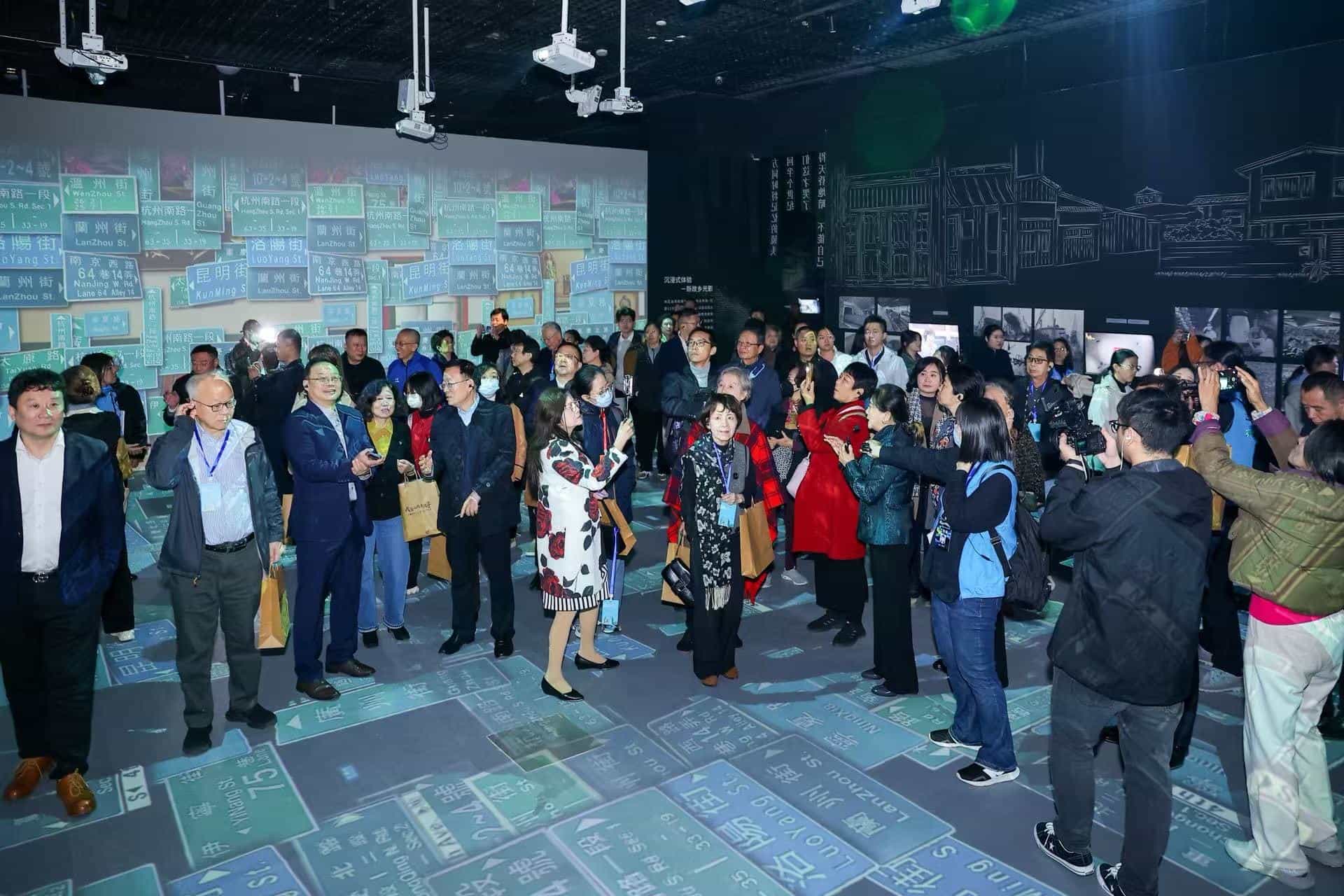 隨後也迫不及待到了展區參觀!才剛踏入展場,就被1949年渡海來臺時的驚濤駭浪給嚇一大跳,主持人李艷秋看到先生李濤主播受訪影片 回憶全湧上心頭。大夥兒們甚至在「新故鄉區」全景投影打造的沉浸式體驗裡,玩起了跳格子一同回憶起當年的眷村時光,真的相當可愛。